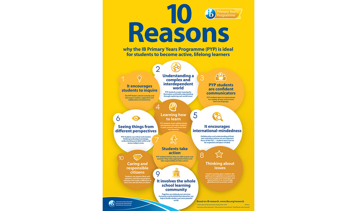 International Baccalaureate (IB) Primary Years Programme is a curriculum framework designed for students aged 3 to 11. It prepares students for the intellectual challenges of further education and their future careers, focusing on the development of the whole child as an inquirer, both in the classroom and in the world outside.